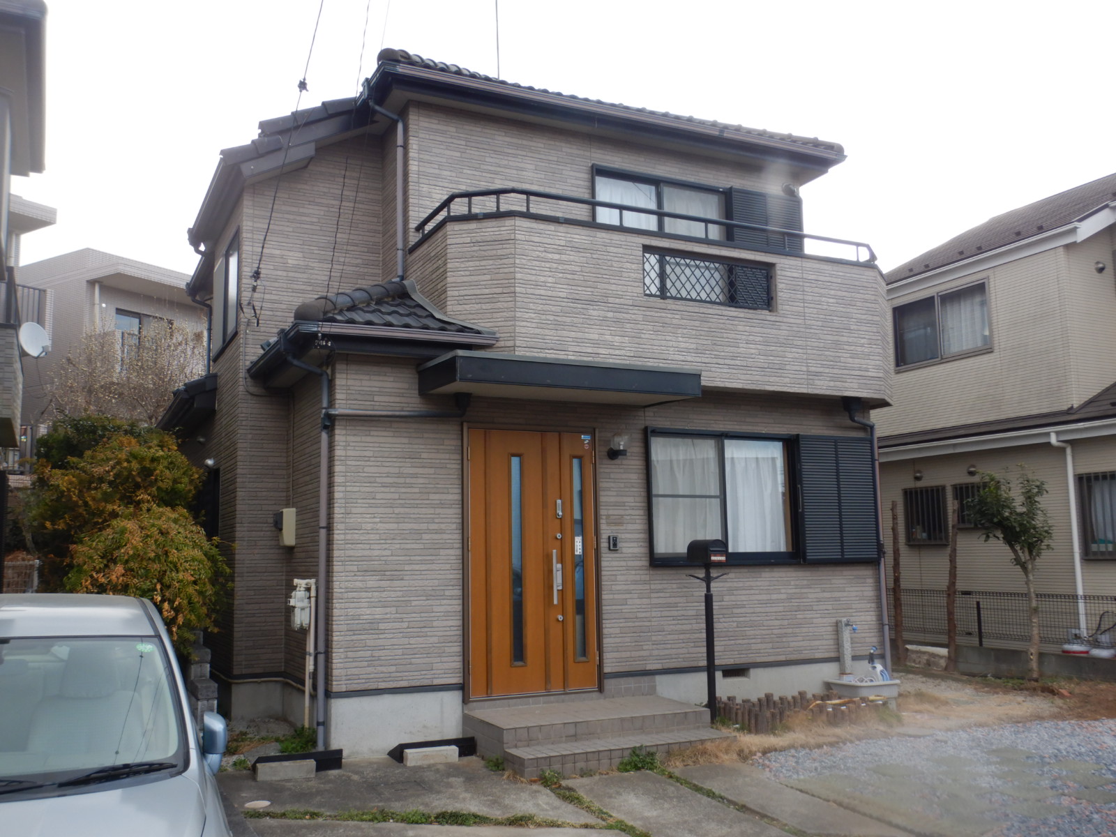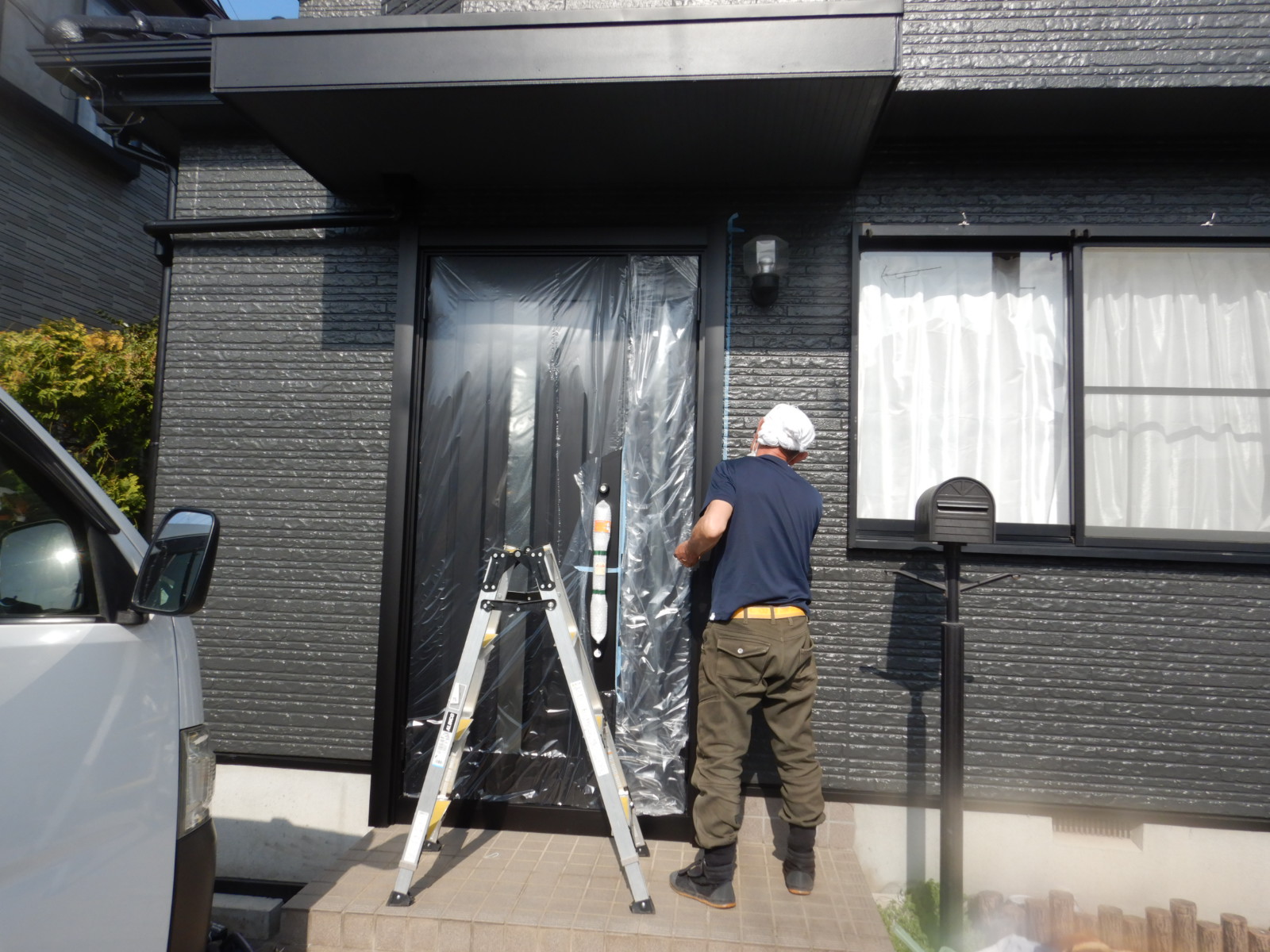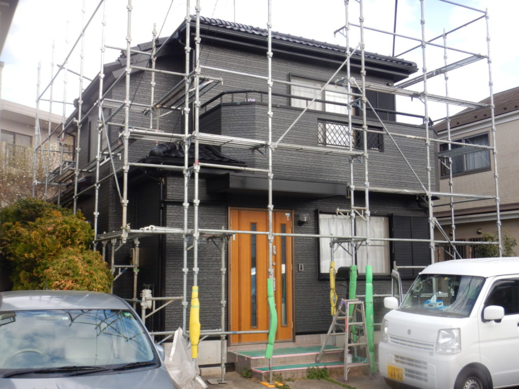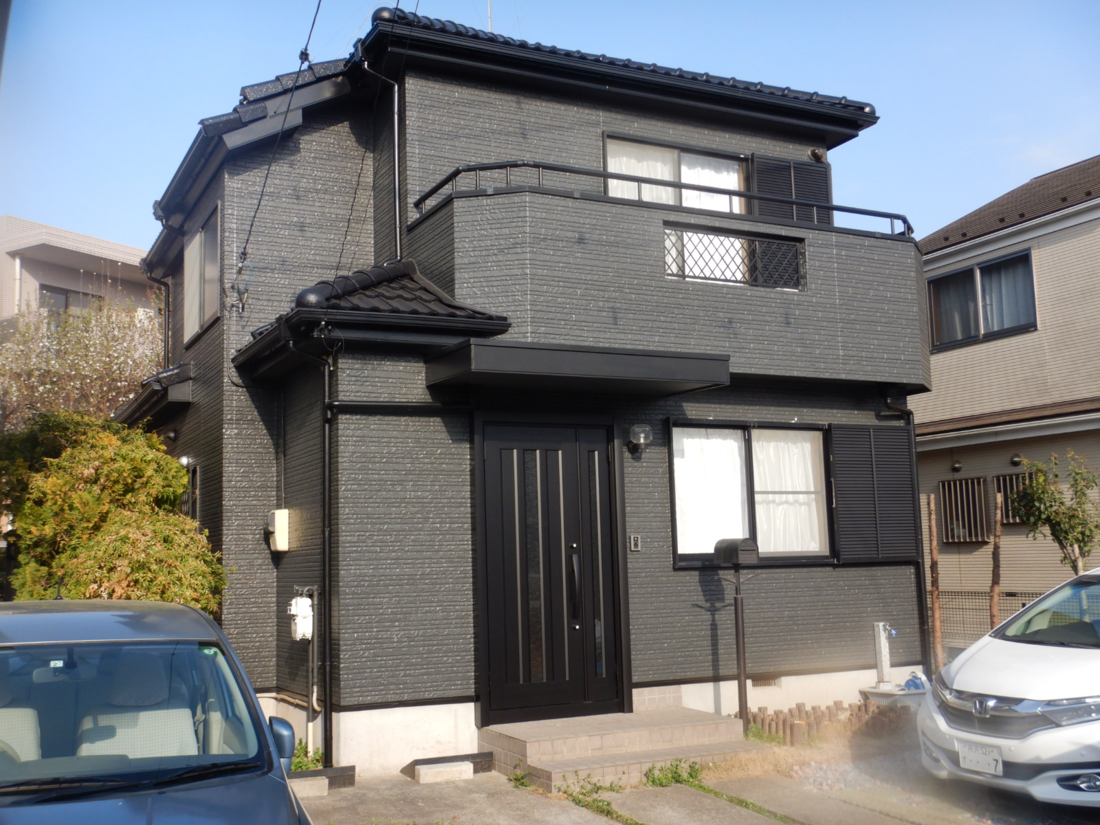 本実績例は築15年強のサイディング外壁で、色褪せ等の劣化がやや強かったこともあり、イメージ一新でツヤを落とした黒系に仕上げました。各部の塗装もツヤを落とし、更に塗装後に玄関扉もマットブラックに交換し、とても良い仕上りになったと思います。