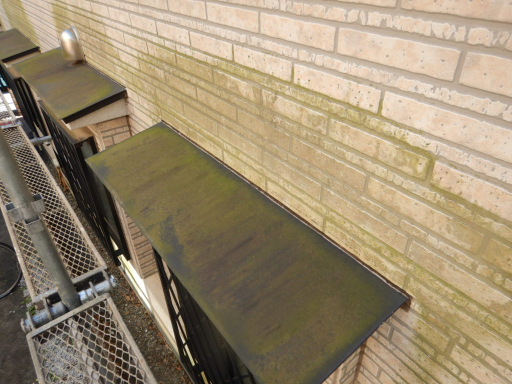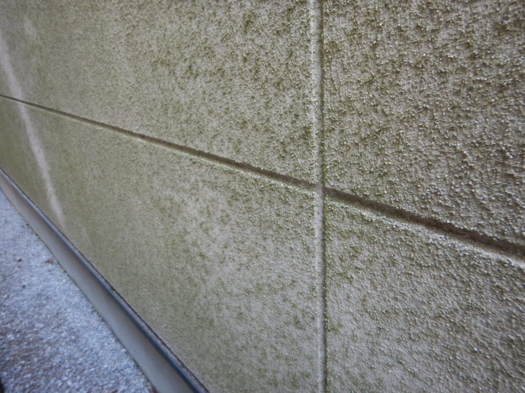北側の外壁などにコケが目立つことが多いです。特にリシン仕上げは防水性が低いのとザラザラした形状なので汚れ、コケ、カビが付きやすいです。