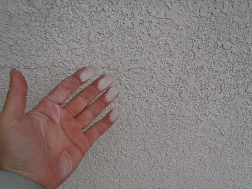塗膜が経年劣化により風化し、塗装面が粉っぽくなる現象です。雨水を防ぐ性能が低下しています。また、塗り替え時にしっかりと洗浄しないと塗膜の接着に問題が出ます。